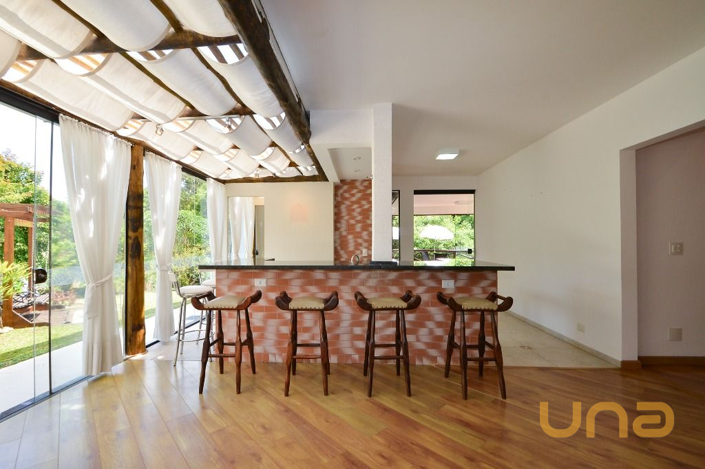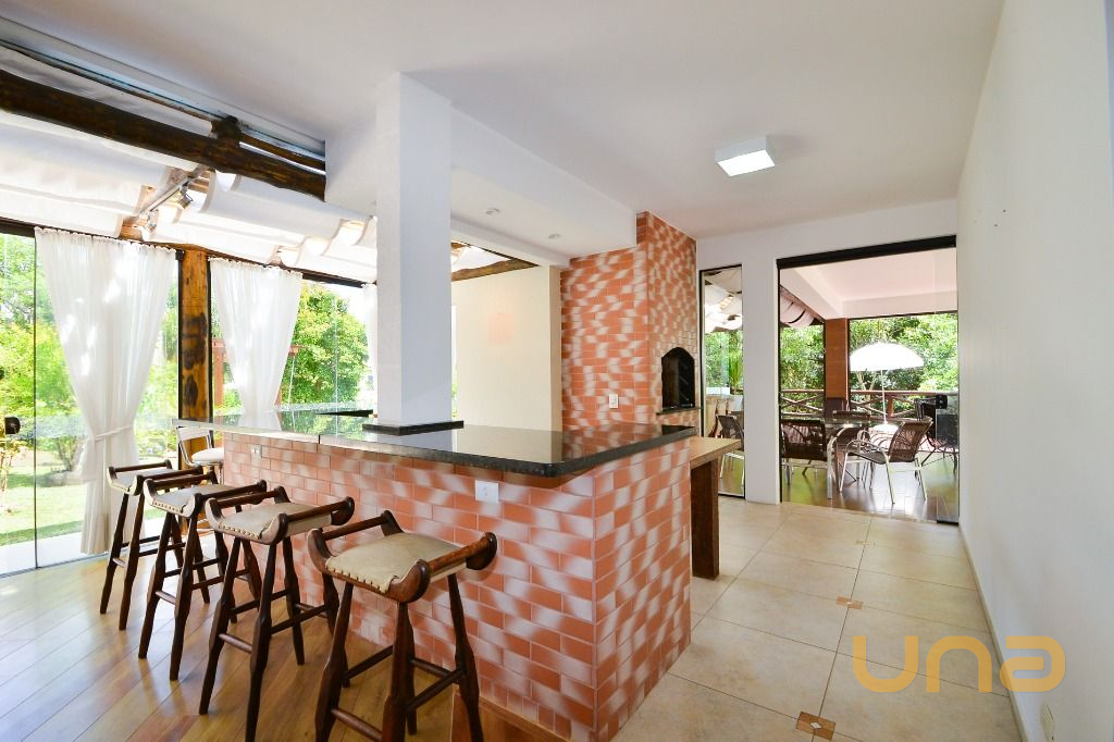 - Área gourmet completa, com bancada, cadeiras, churrasqueira e fogão a lenha