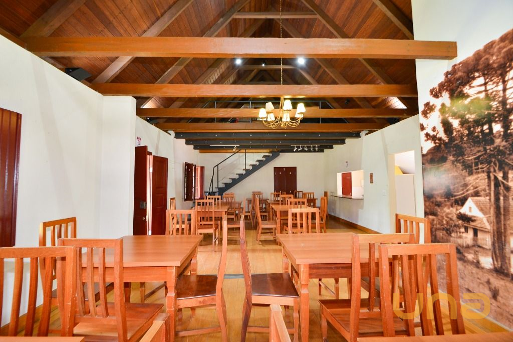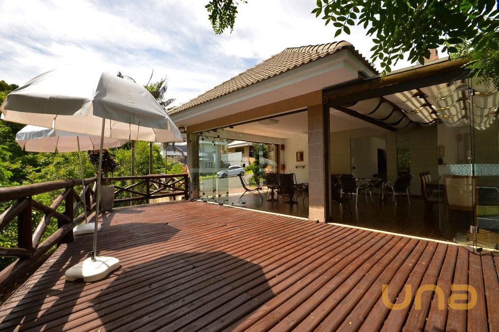 - Área integrada a área gourmet, com mesas e cadeiras, anexa ao deck externo com guarda-sóis e vista para a natureza