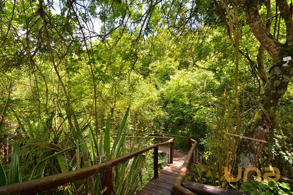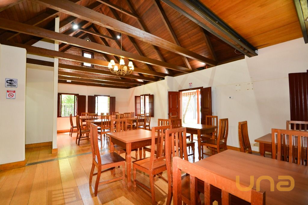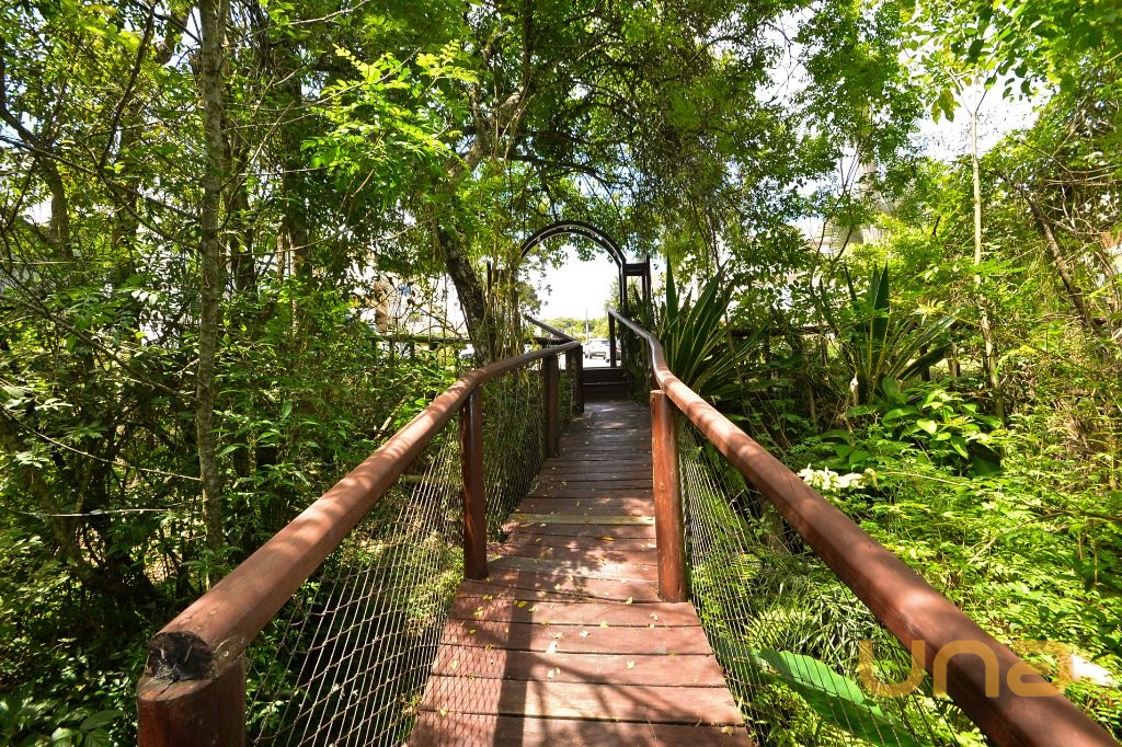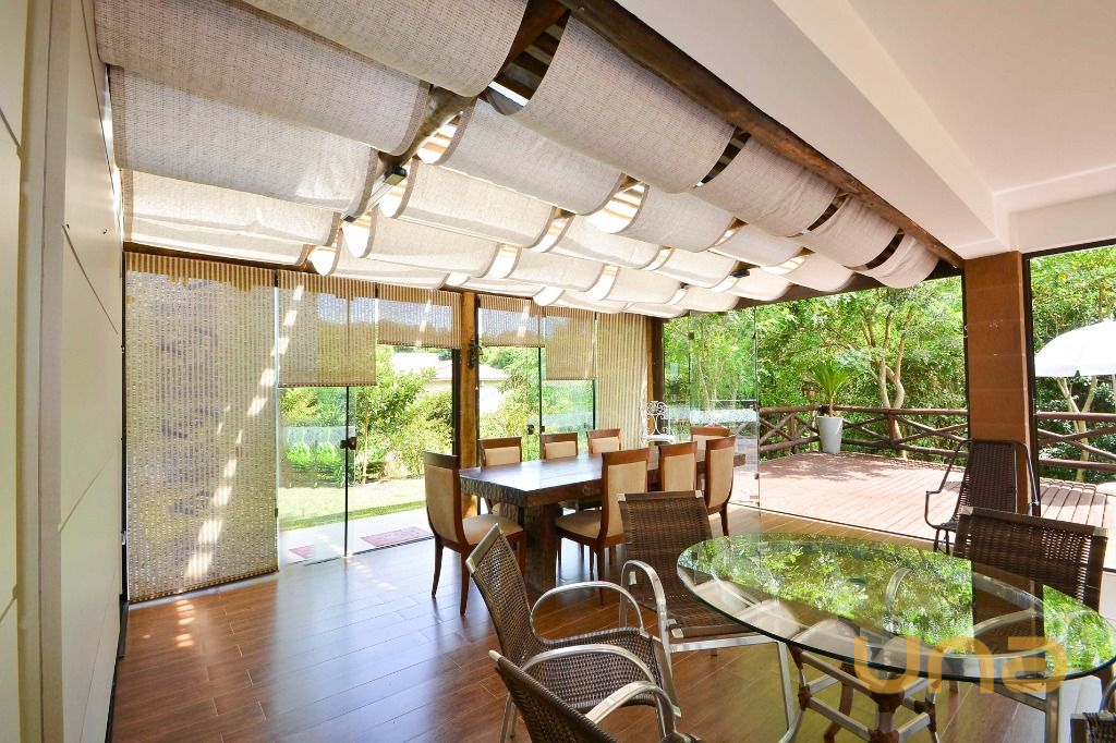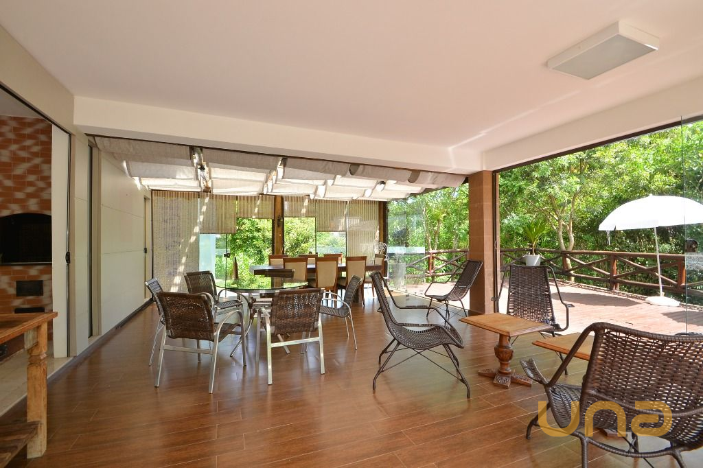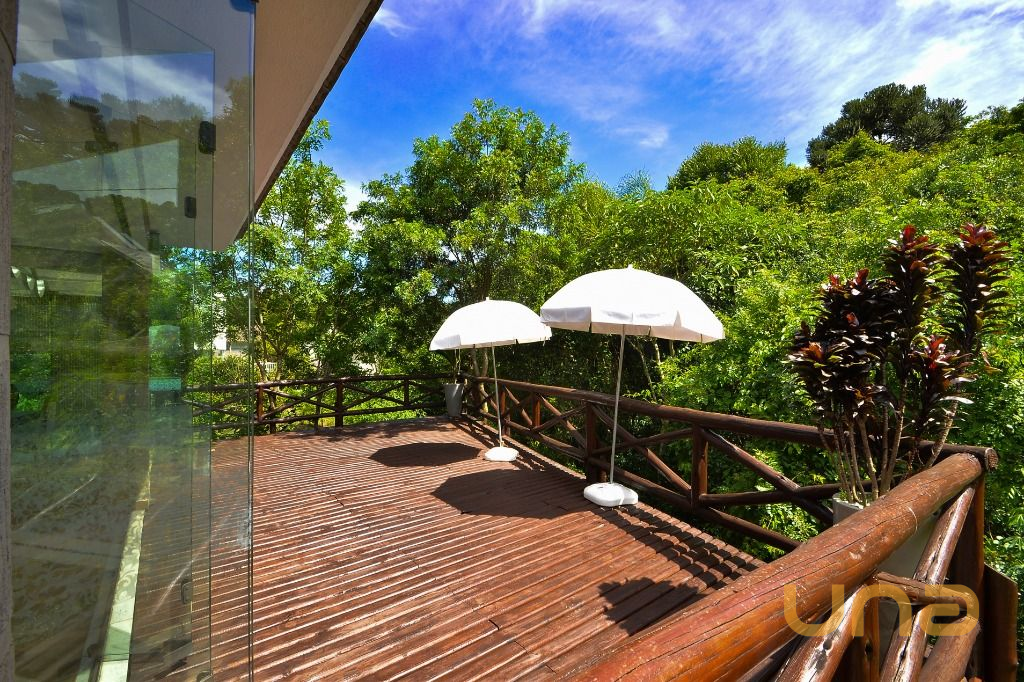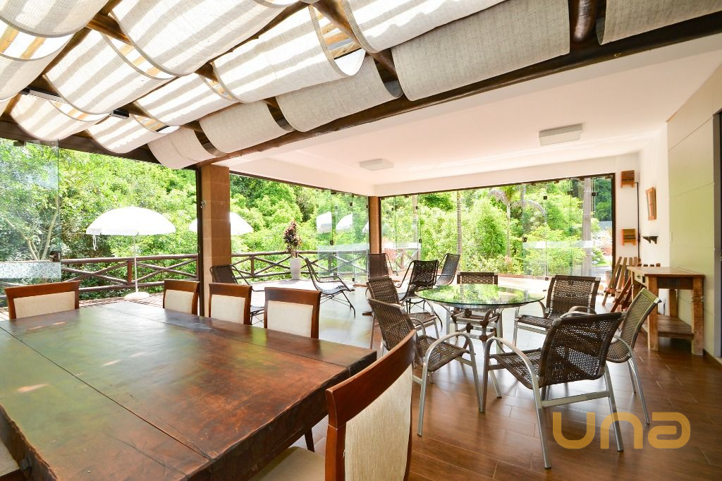 - Área integrada a área gourmet, com mesas e cadeiras, anexa ao deck externo com guarda-sóis e vista para a natureza