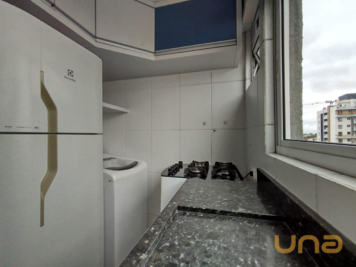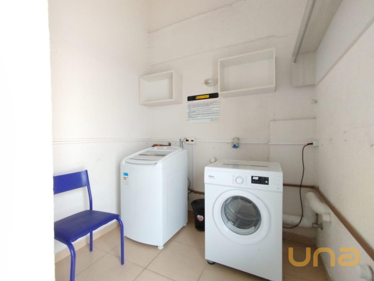 * Cozinha equipada com armários, fogão, geladeira e máquina de lavar roupa;