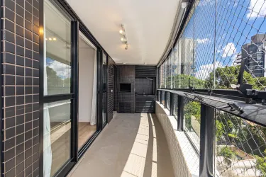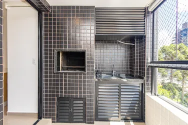 Ampla sacada com churrasqueira, rede de proteção e vista aberta, com integração entre os ambientes;