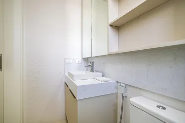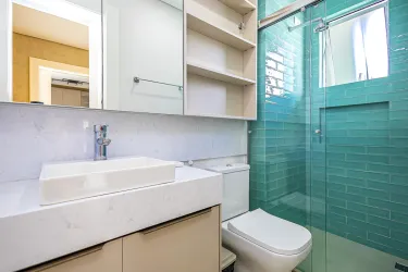 01 Bwc social com acabamento moderno, box em vidro e armário;