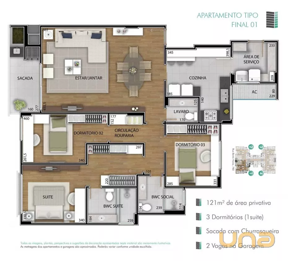 O apartamento face norte, ensolarado com incidência de sol em todos os cômodos durante o dia, possui 03 quartos com armários sendo 01 suíte; Sala ampla para dois ambientes, sacada e churrasqueira, cozinha com armários, forno embutido, cooktop e coifa, geladeira, tudo de excelente qualidade.