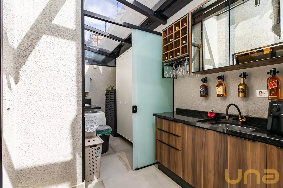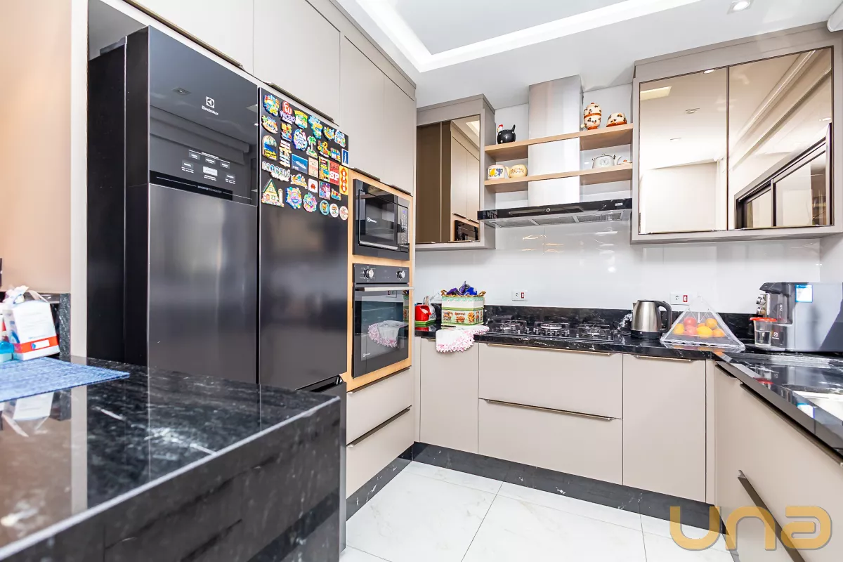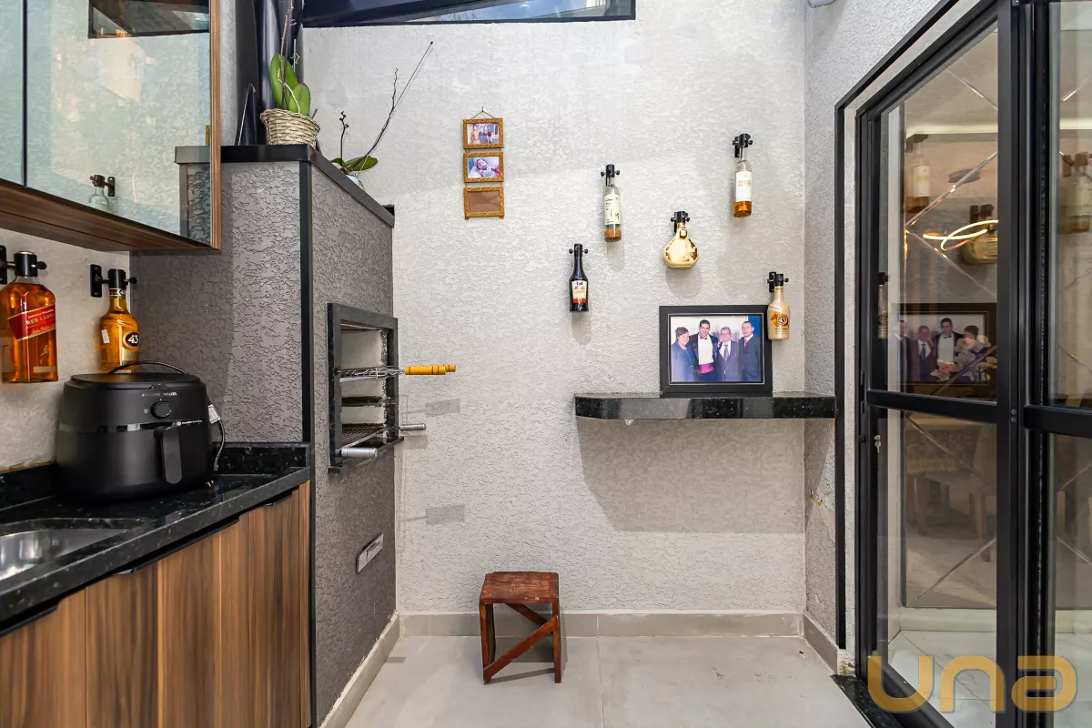 Sala de estar e jantar integradas, com ar-condicionado. Ainda no primeiro pavimento, um lavabo e cozinha modernizada com armários planejados e iluminação projetada. Aos fundos, uma churrasqueira com teto retrátil e área de serviço.