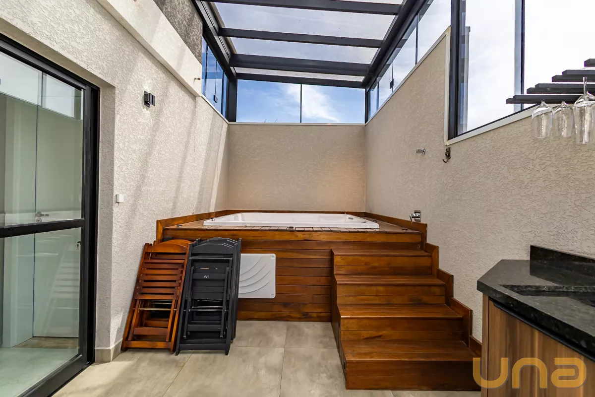 Ático com teto retrátil e uma jacuzzi privativa, o espaço externo tem uma vista livre perfeita pra finalizar o dia com relaxamento. Possui também mais uma sala que pode ser facilmente adaptada para mais um quarto ou um escritório para home-office.