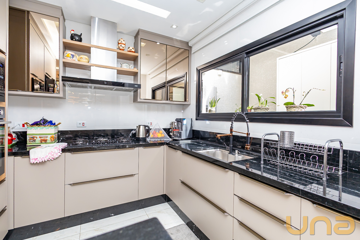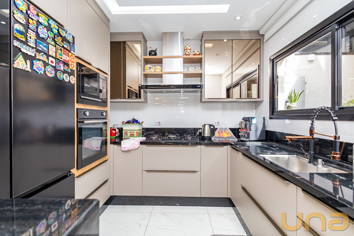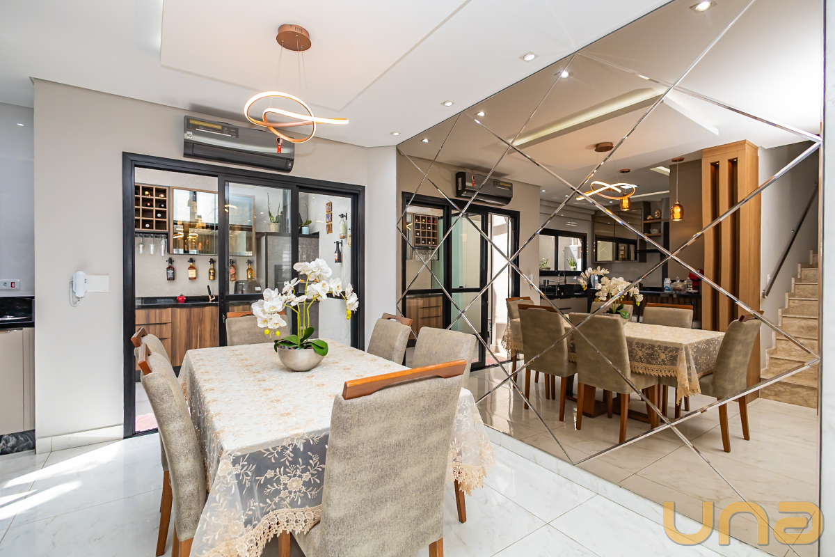 Sala de estar e jantar integradas, com ar-condicionado. Ainda no primeiro pavimento, um lavabo e cozinha modernizada com armários planejados e iluminação projetada. Aos fundos, uma churrasqueira com teto retrátil e área de serviço.