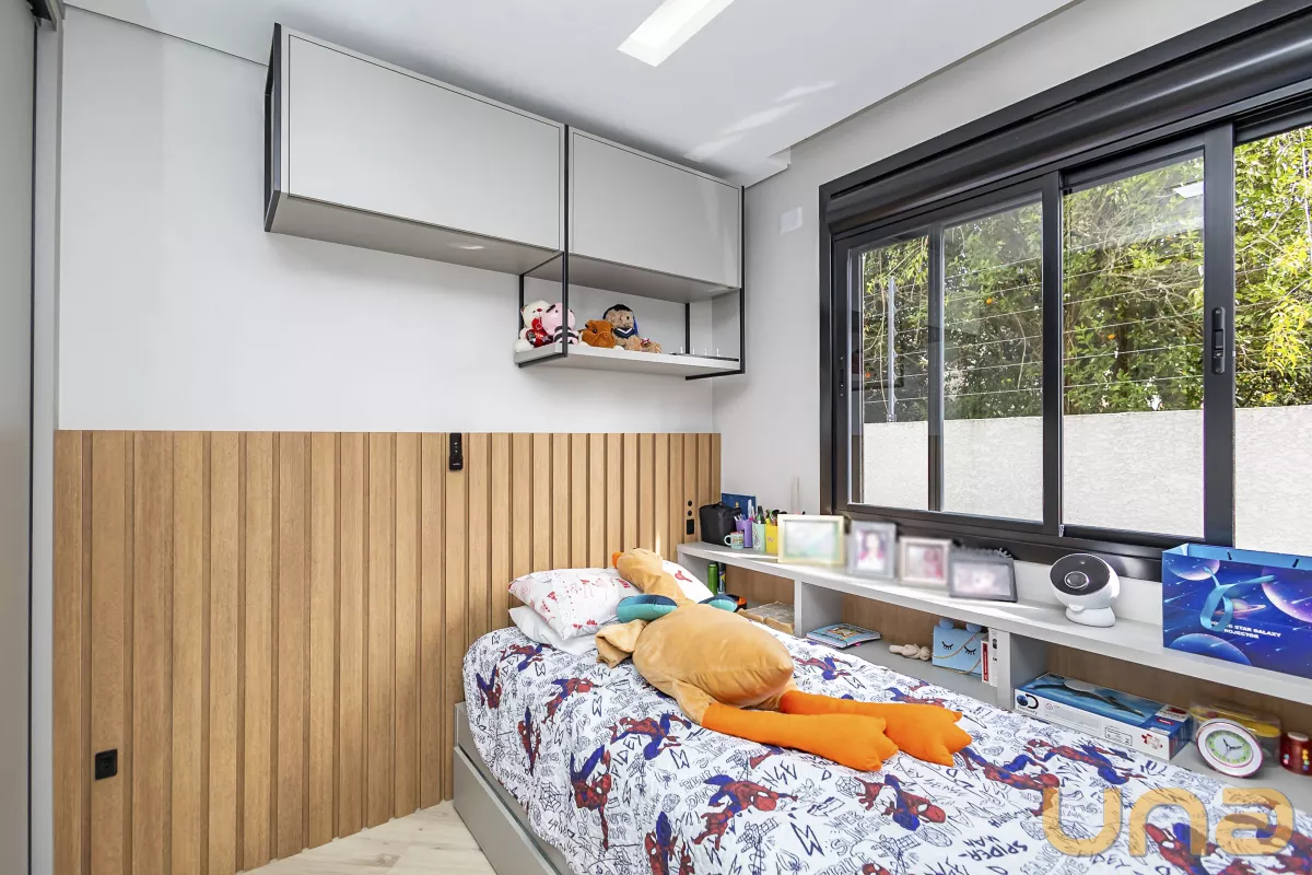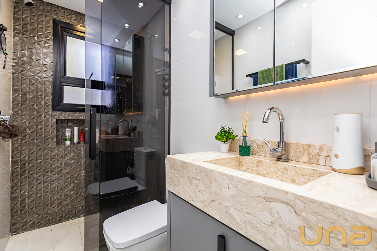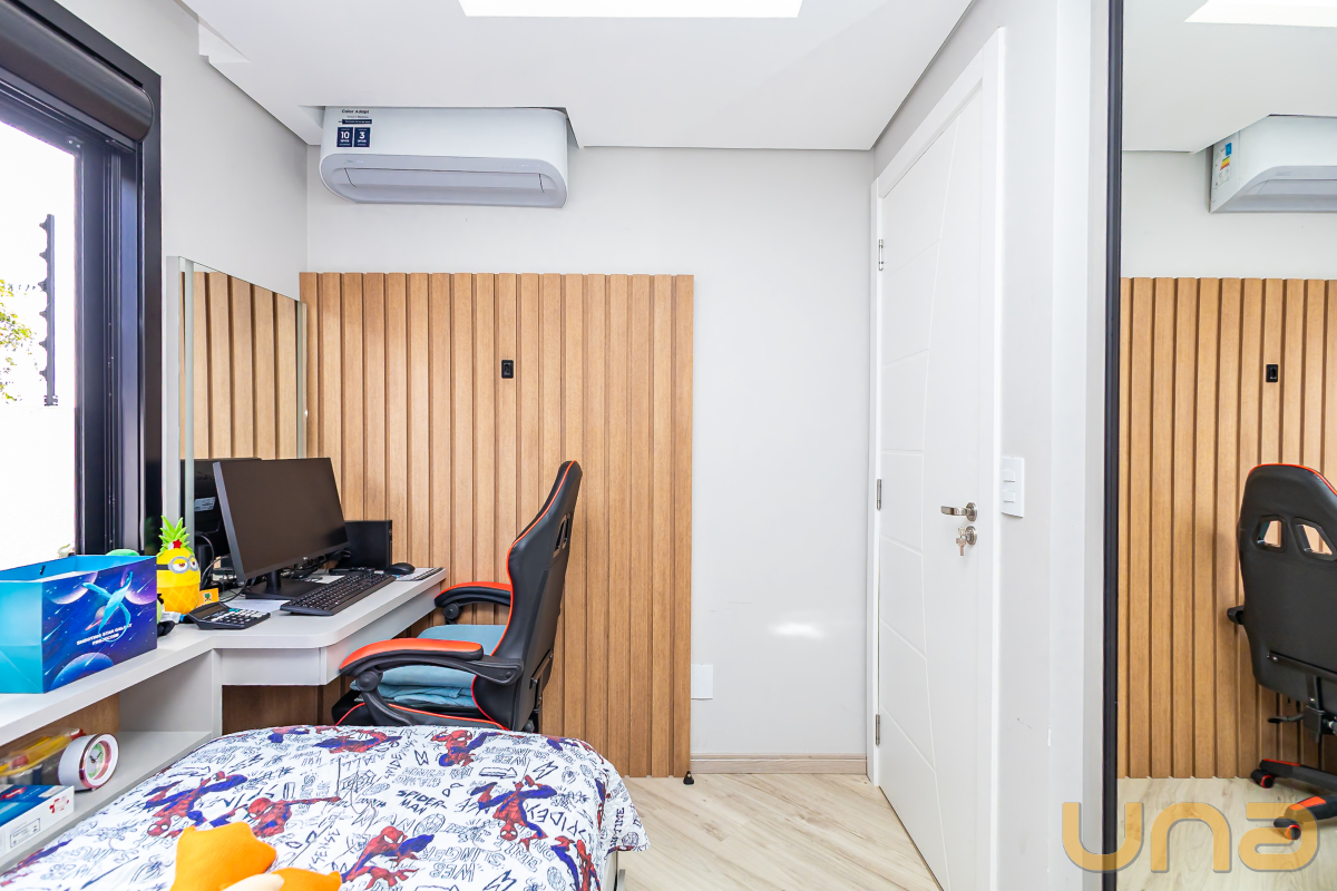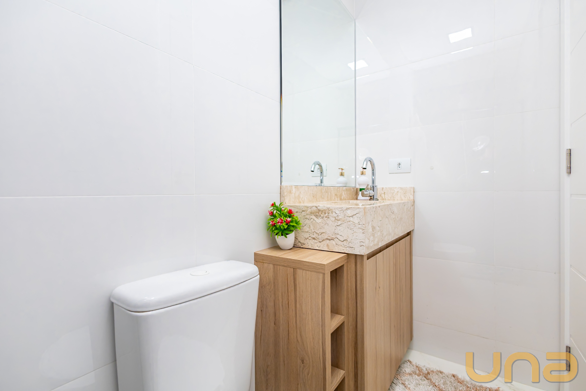 São 3 quartos, sendo uma suíte. Todos com ar condicionado, venezianas eletrônicas e armários planejados. Possui 2 banheiros sociais (1º andar e ático), o banheiro da suíte e o lavabo no térreo, totalizando 4 banheiros. Famílias grandes e visitas não serão um problema!