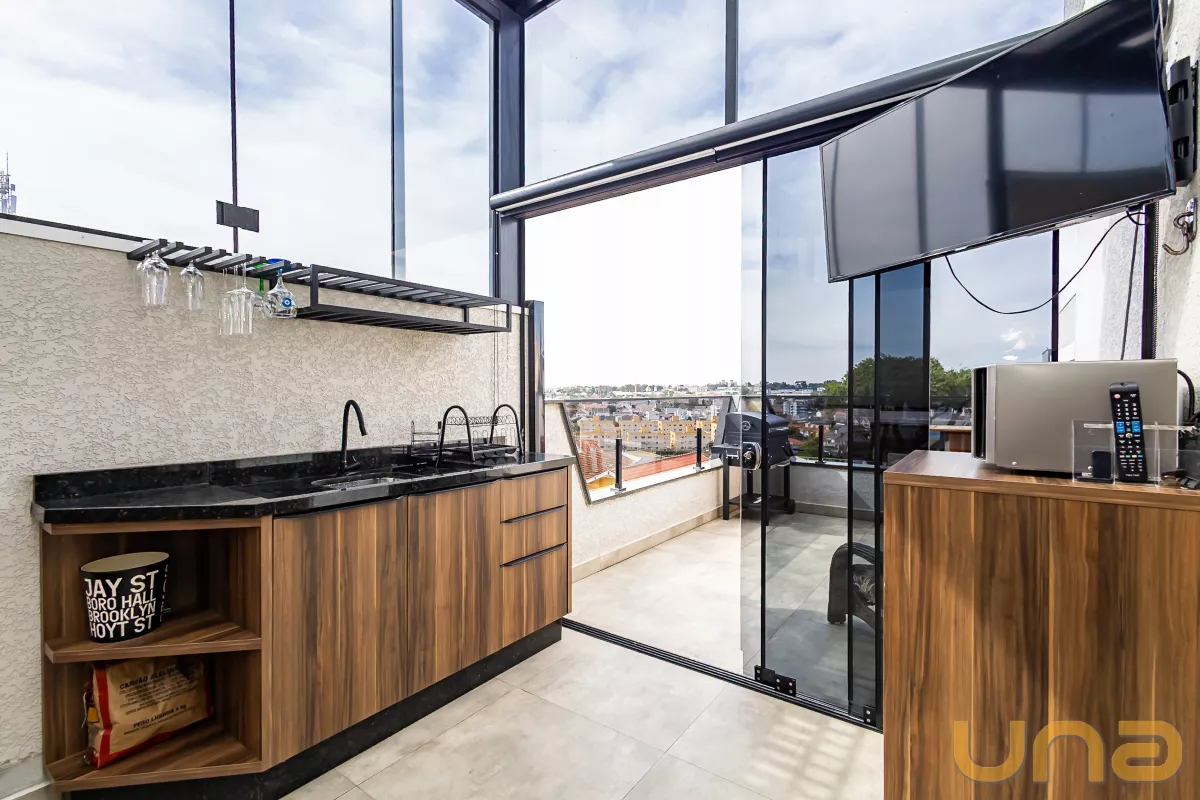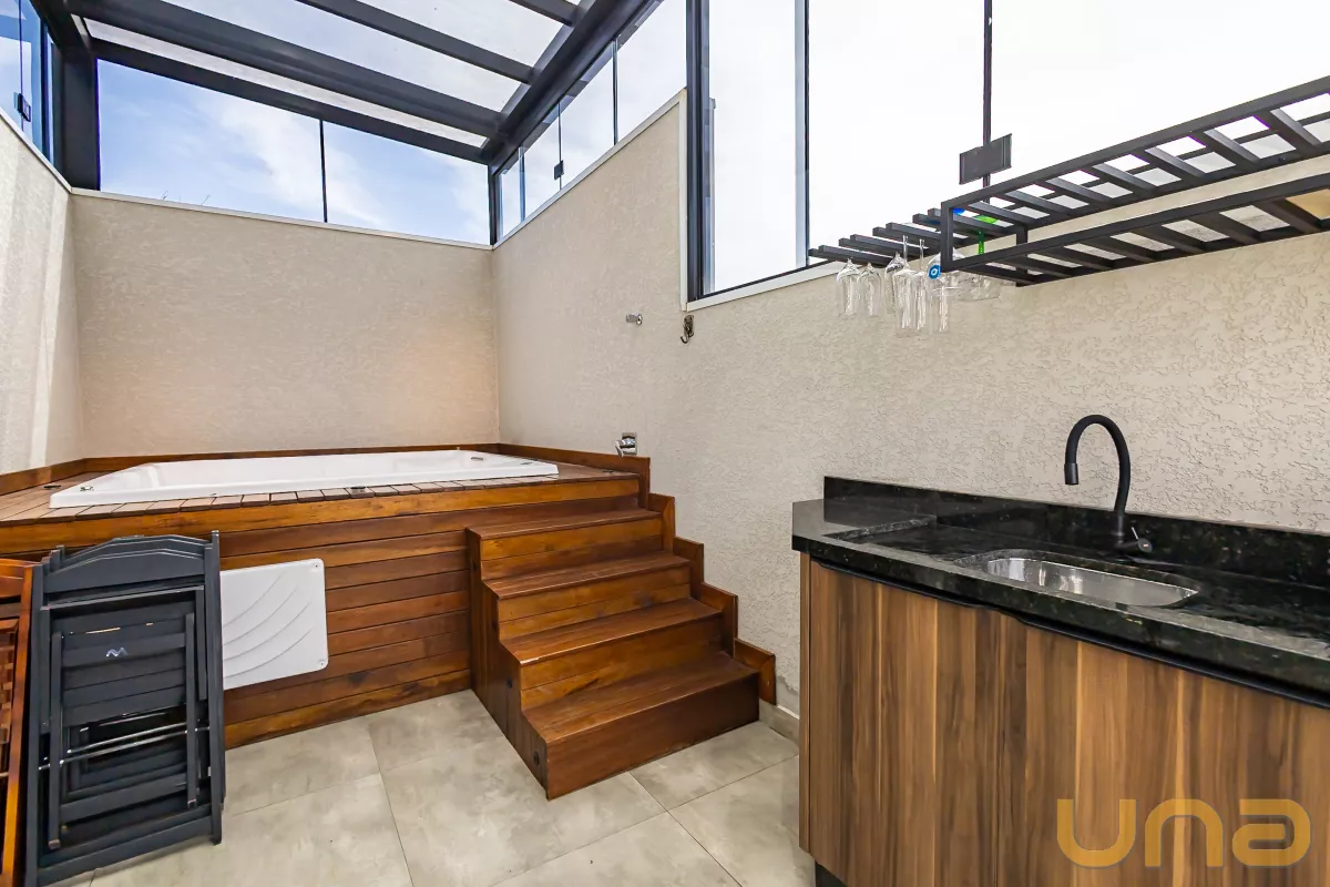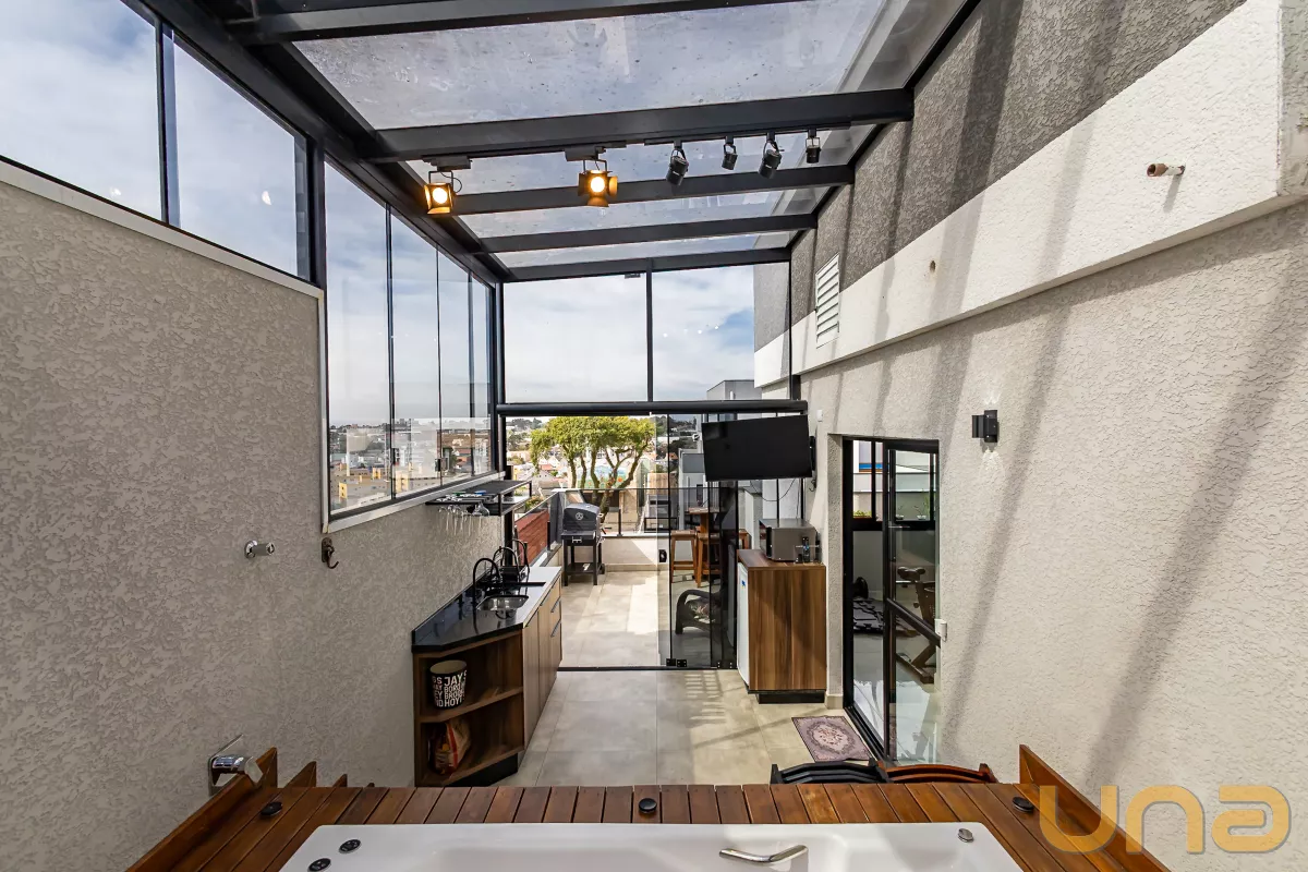 Ático com teto retrátil e uma jacuzzi privativa, o espaço externo tem uma vista livre perfeita pra finalizar o dia com relaxamento. Possui também mais uma sala que pode ser facilmente adaptada para mais um quarto ou um escritório para home-office.