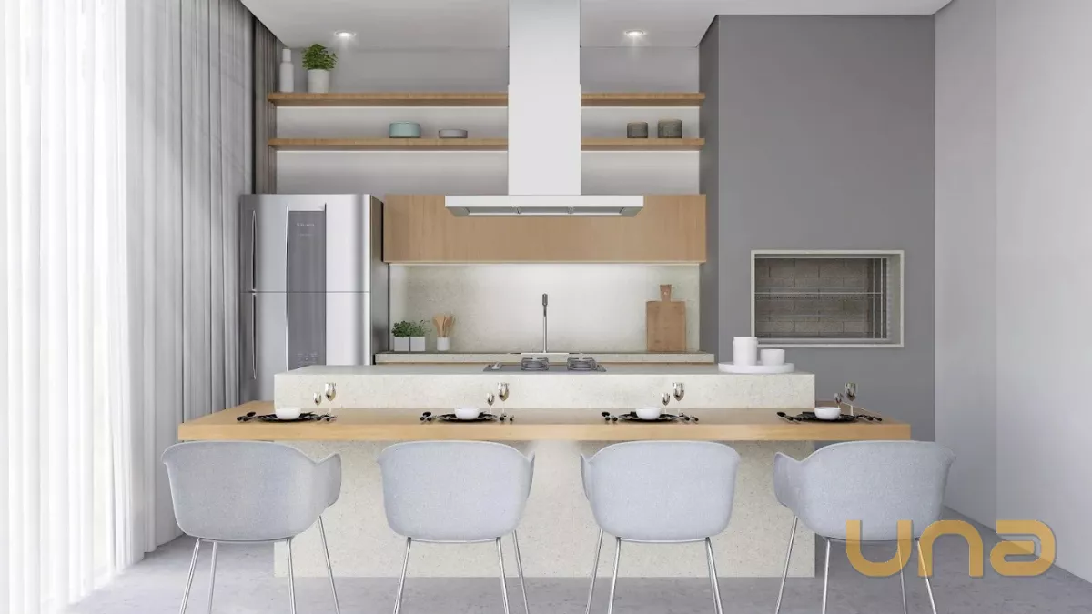 Cozinha, sala com sacada e churrasqueira, banheiro social e área de serviço.