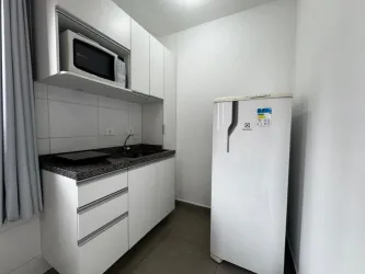 - Cozinha com armários, Micro-ondas, Cooktop elétrico e Geladeira