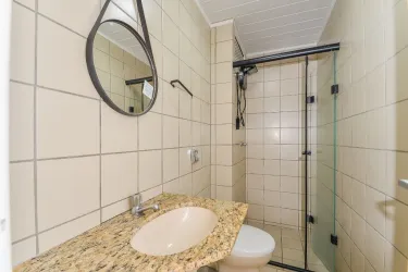 - Banheiro com box em vidro temperado e chuveiro elétrico.