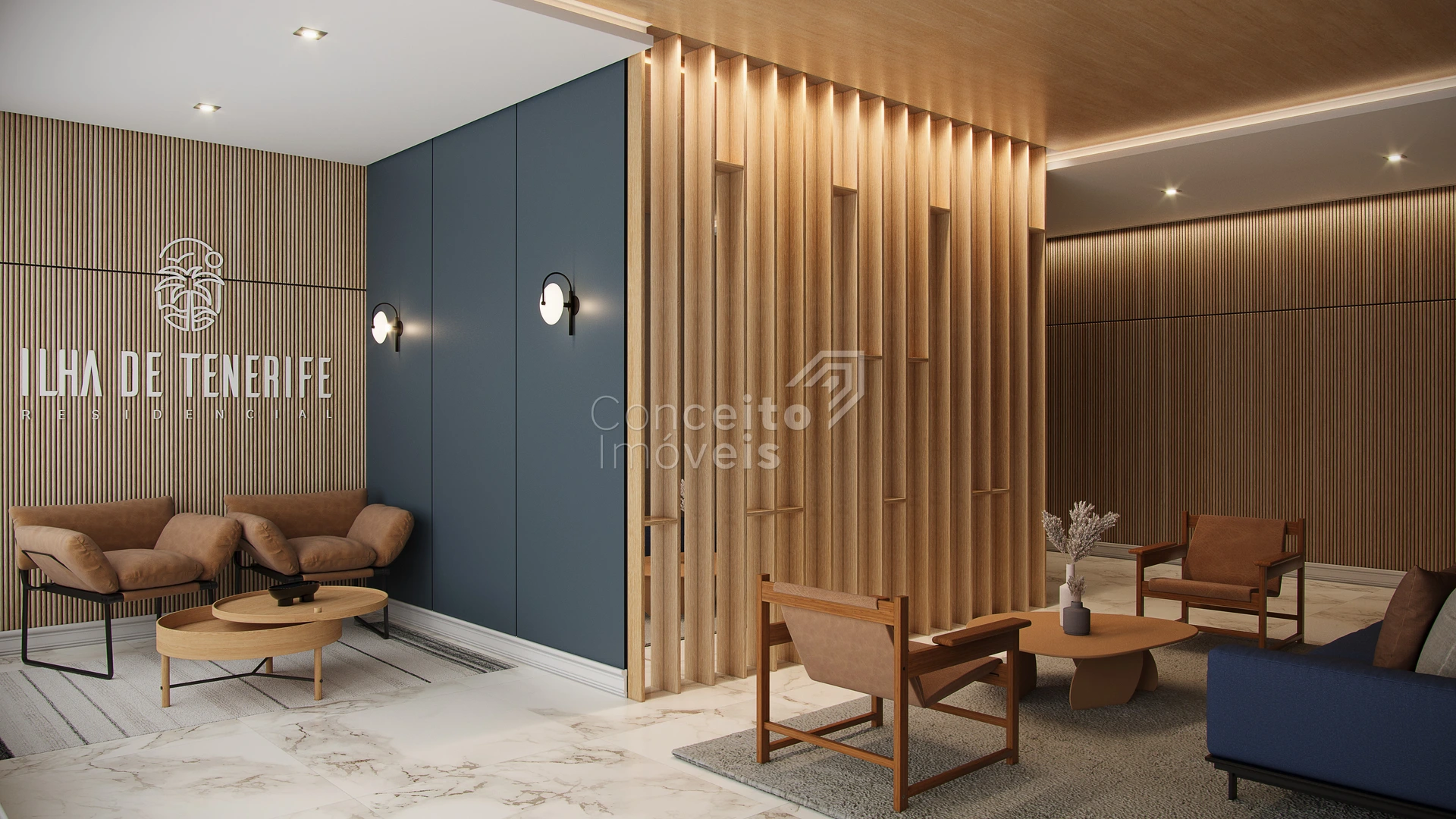 A chegada ao Ilha de Tenerife é impactante. O hall social apresenta uma composição de materiais nobres, iluminação cênica e design sofisticado, criando uma atmosfera que comunica, de imediato, o padrão elevado do empreendimento. Cada detalhe reforça a sensação de estar em um endereço verdadeiramente diferenciado.