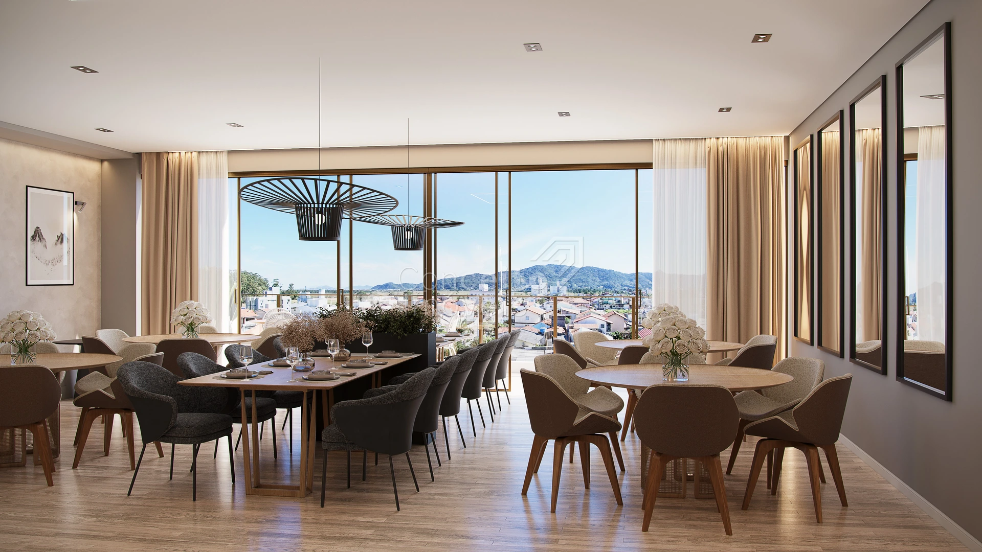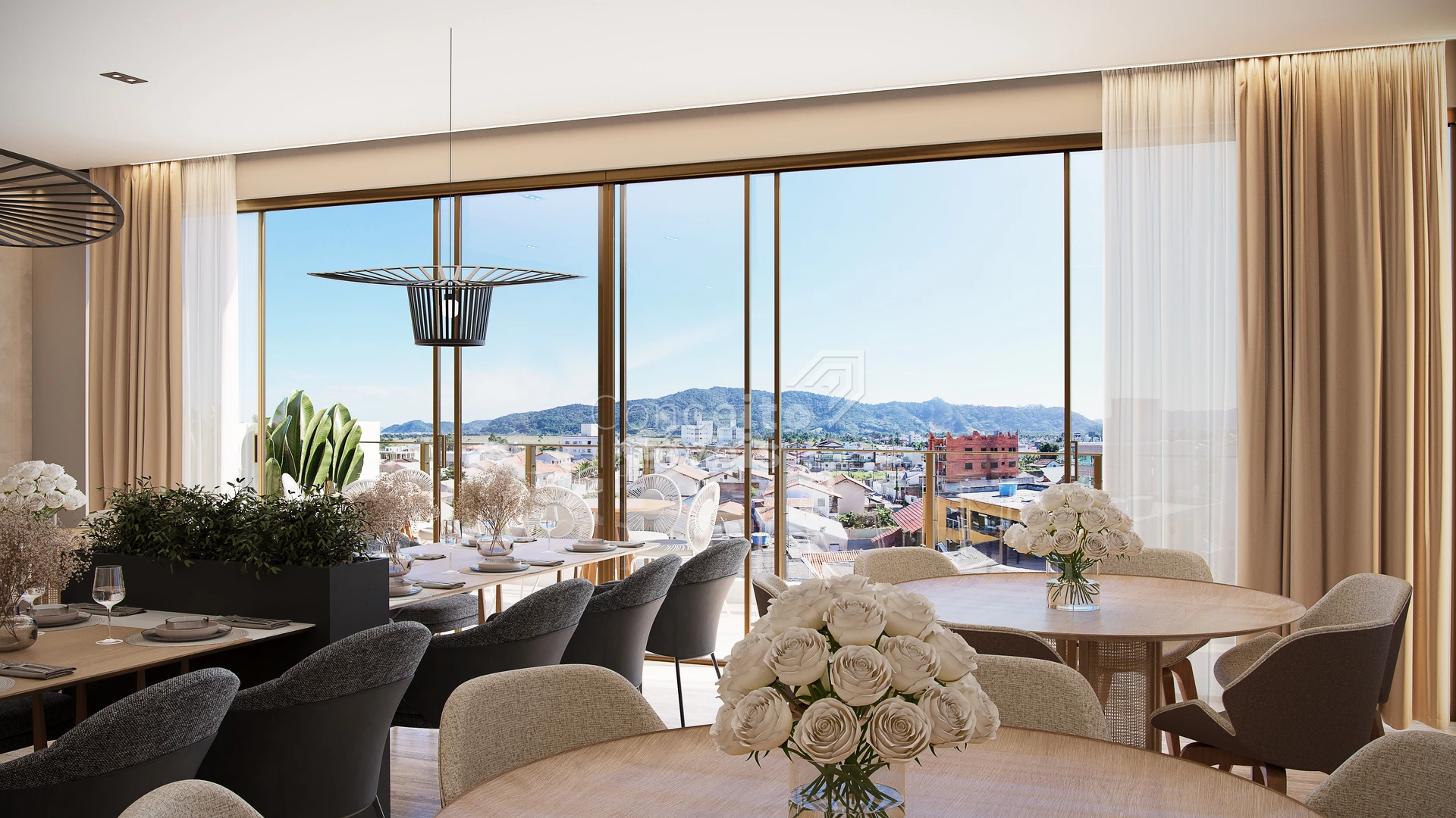 Grandes aberturas envidraçadas, que proporcionam iluminação natural abundante e uma conexão visual privilegiada com o entorno.
