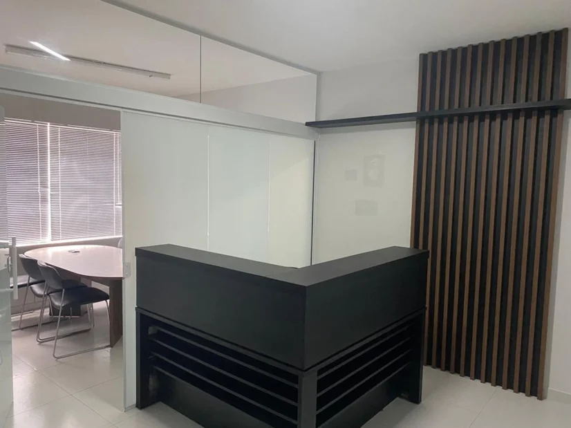 Entrada que se divide em dois ambientes distintos: recepção e área de trabalho